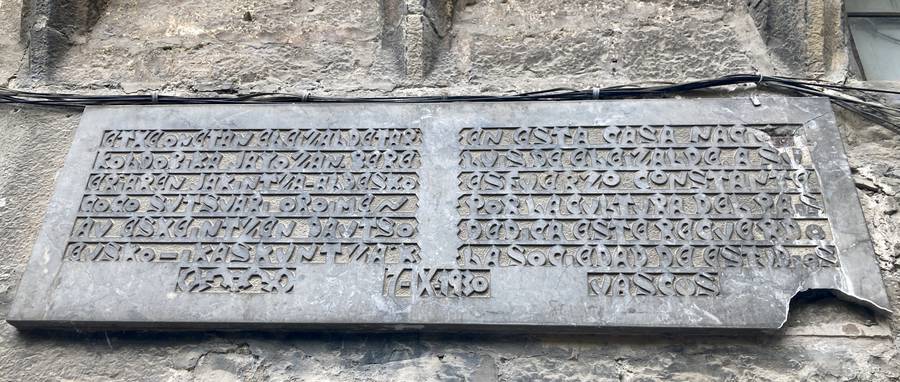 “Etxe onetan Eleizalde’tar Koldobika jayo zan. Bere eriaren jakintza-aldezko gogo sutsuari oroimen au eskeintzen dautso Eusko Ikaskuntza’k / En esta casa nac[ió D.] Luis de Eleizalde. A su esfuerzo constante por la cultura del país dedica este recuerdo la Sociedad de Estudios Vascos. 7-IX-1930”.
