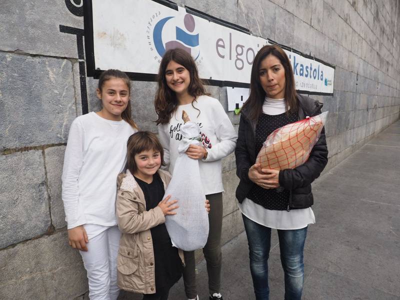 Pilota egunean zozkatutako bi urdaiazpikoen irabazleak pozik, euren sariekin. Ezkerretik eskumara, Nahia Urbiola, Esnaola, Irati Urbiola eta Leire Sanchez. On egin!!!