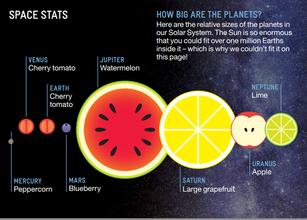 Planeten arteko alderaketa ez da erreza, izan ere tamainak erraldoiak dira. Horregatik, errezxago alderatzeko ezagutzen ditugun gauzaekin alderatzea komeni zaigu, Eta helburu horrekin duzu harraian txertatutako irudia, non fruitu bakoitzak planeta bat irudikatzen duen. Ez lagungarria zaizun.