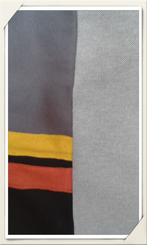 Loneta grisak, zinta mostaza eta berejenarekin.