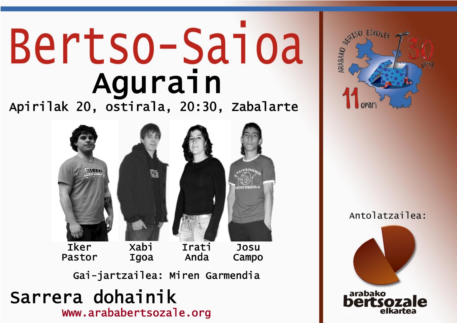 Ostiralean ZABALARTEN HITZORDUA, 20:30etan
