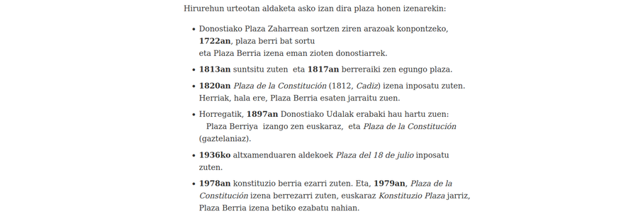 Plaza Berriya izango zen euskaraz, eta Plaza de la Constitución (gaztelaniaz). - 1936ko altxamenduaren aldekoek Plaza del 18 de julio inposatu zuten.
