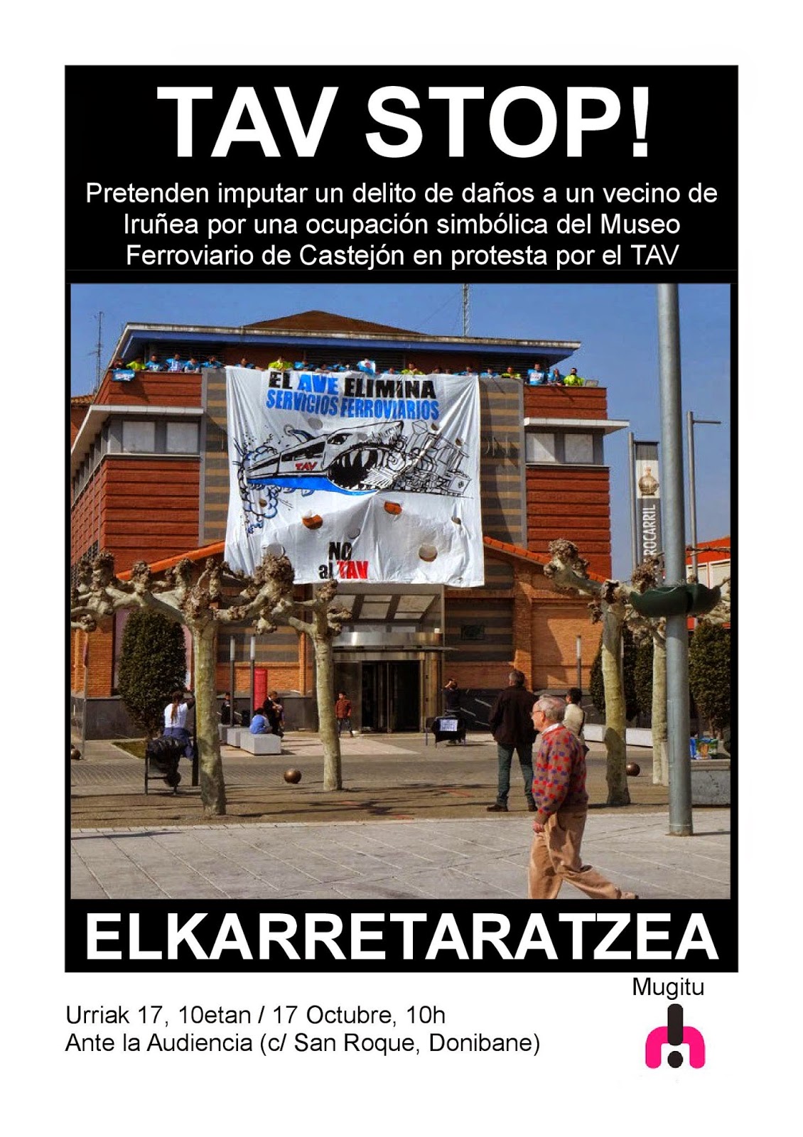 Sin embargo, la Policía Foral imputa ahora a un joven de Etxabakoitz un delito de daños, supuestamente incurridos durante dicha acción. Esta persona tendrá que declarar ante el juez este viernes día 17 de octubre en la Audiencia Provincial de Navarra. Al igual que a una vecina de Tudela, se le imputa un delito de daños en el Museo Ferroviario de Castejón en el contexto de una acción de protesta contra el TAV ocurrida el pasado 15 de marzo. Desde Mugitu Mugimendua lo consideran "un nuevo episodio en la criminalización" de la oposición al TAV.