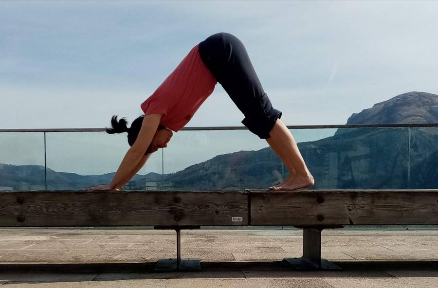 - Oinetako behatzak lurrean jarri eta eskuetan ere indarra eginez, arnasa hartuz, aldakak altxatu besoak eta bizkarrezurra luzatuta gelditzen diren arte. Mendi edo hiruki forma hartuko du gure gorputzak.