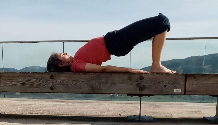- Hasieran, arnasari jarraituz, era dinamikoan egingo dugu asana hau (3-4 aldiz). Praktika pixka bat hartuta daukagunean, bizkarrezurra goian dugunean arnasketa batzuz geldituko gara era estatikoan (3-4 arnasketaz).