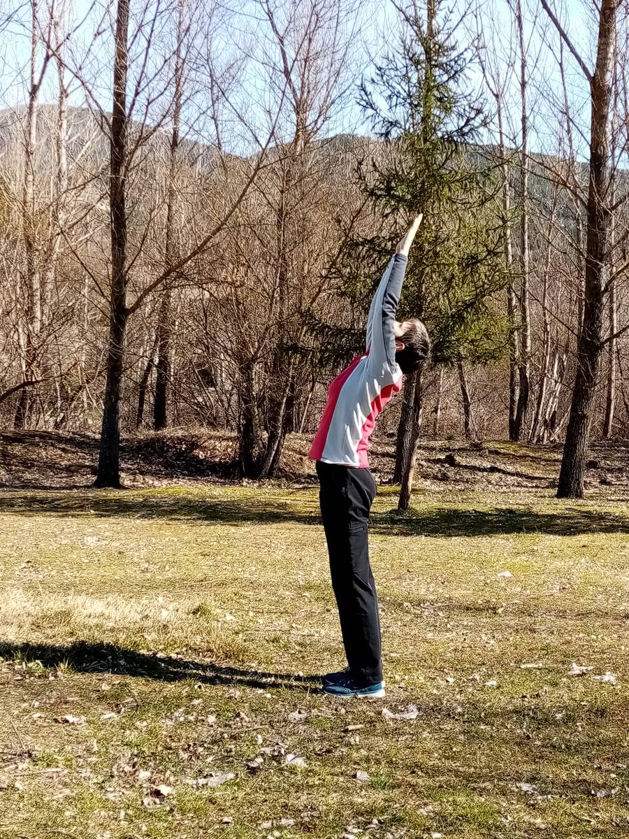 - Arnasa botaz atzerakako bidea egingo dugu: lehenbizi bizkarrezurra ornoz orno zutik jarriko da besoak goian daudela eta ondoren besoak jaitsiko ditugu.