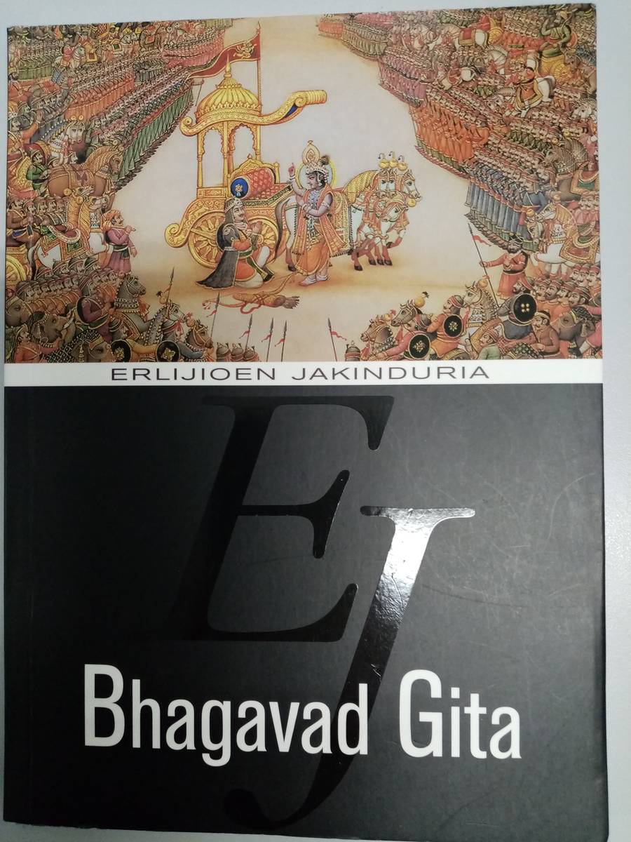 "Bhagavad Gita". Zorionez, euskarazko bertsioa ere badugu! Ibaizabal argitaletxearena. Euskarazko bertsio honetatik hartu dugu gaurko informazio gehiena. (Argazkian agertzen dena).